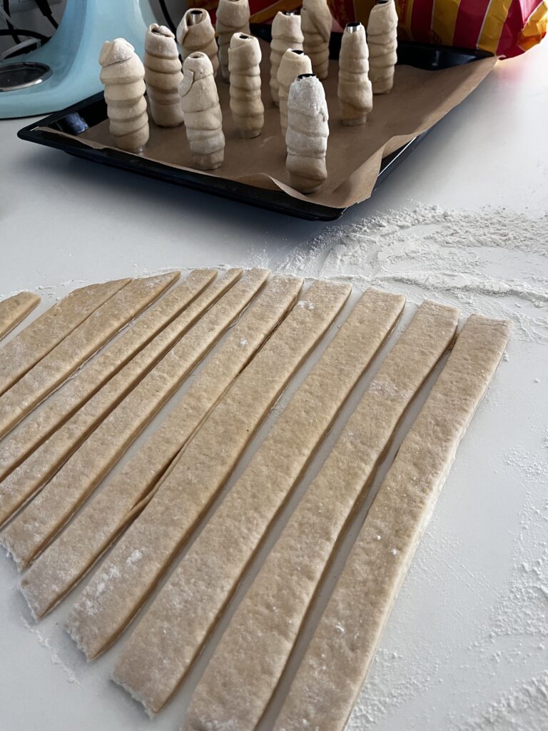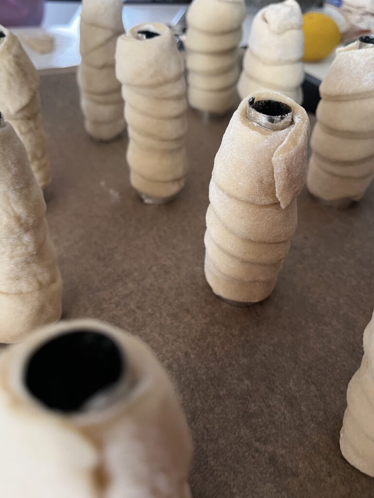 - Nun die Teigstreifen um einen ca. 20 cm langen und 4 cm dickes feuerfestes Buchenholz oder eine Schaumrolle aus Metall wickeln und im Ofen bei 180 Grad ca. 20-25 Minuten backen.