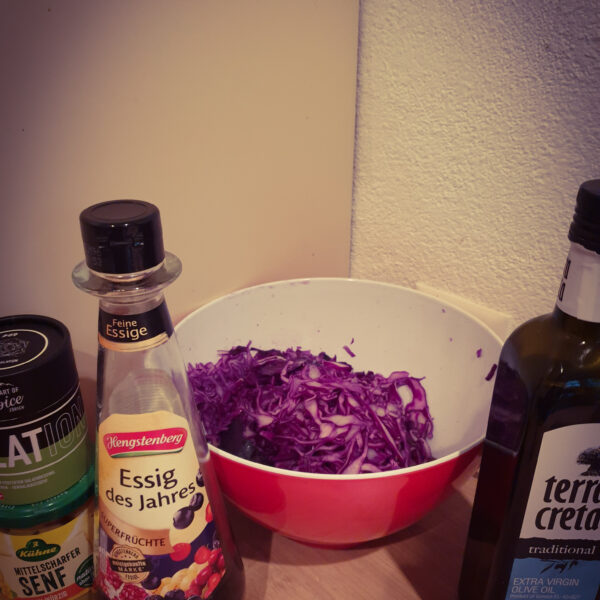 Am besten Schmeckt der Rotkohlsalat, wenn ihr ihn zwei Stunden ziehen lässt.
